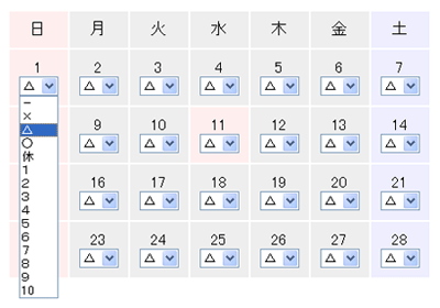 2.各日の欄のプルダウンリストにより、空き情報を選択していきます。
